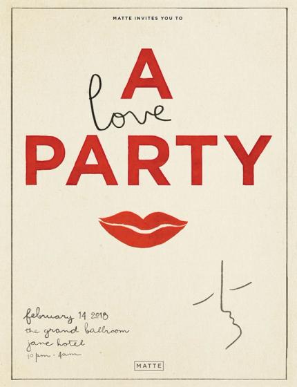 MATTE Projects threw a once-in-a-lifetime love party for Valentine's Day in 2018. “A lover's ball - held at the grand ballroom in the Jane Hotel. A night not for the faint of heart. We got loose with compassion and drowned in the delicious ambiance of love.” DJ sets from Justin Strauss & Chloe Caillet brought the bodies to the dancefloor all night.