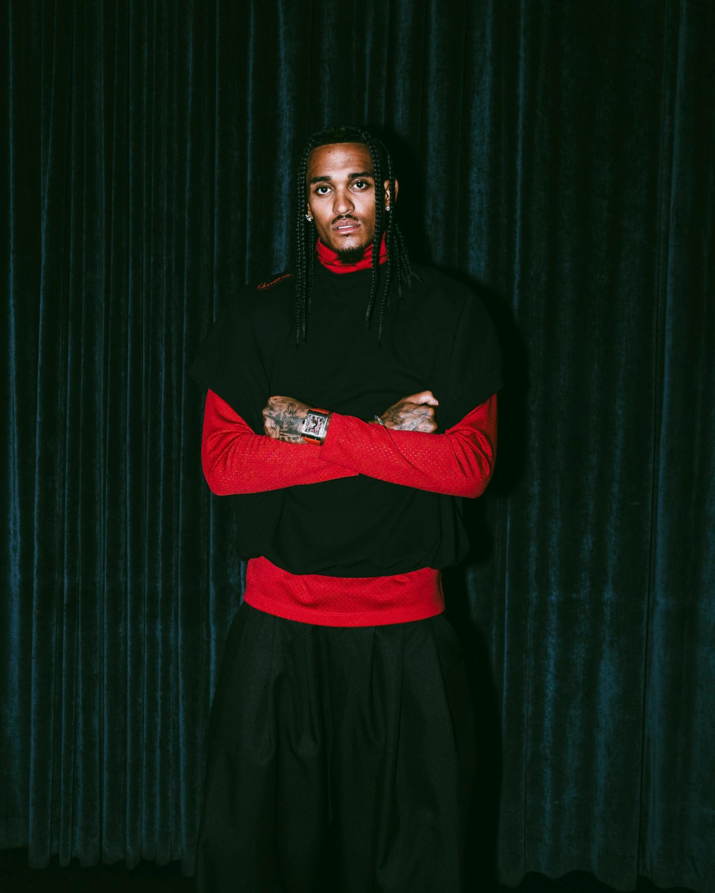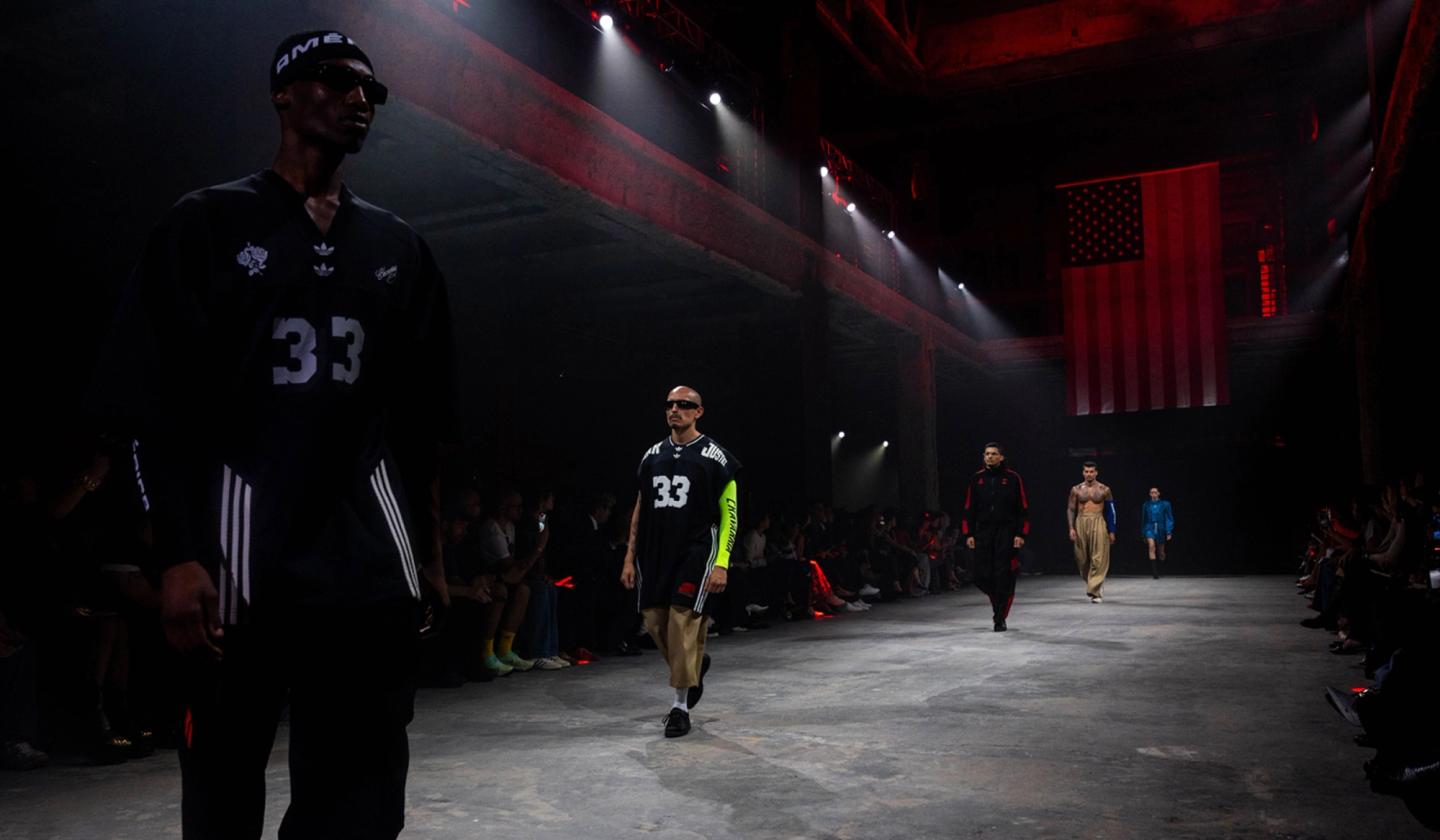 Part II—featuring the collaboration between Willy Chavarria and Adidas—is inspired by counter-culture spaces. Heavy haze, red lights from above, and techno music transport guests below the surface. This transition from the sacred and solemn atmosphere of Part I to the edgier, grittier vibe of Part II symbolizes a shift from tradition to rebellion. The dynamic lighting and pulsating beats energize the space, highlighting the bold, avant-garde designs and urban aesthetic of the collection, creating a stark and exciting contrast to the first segment.